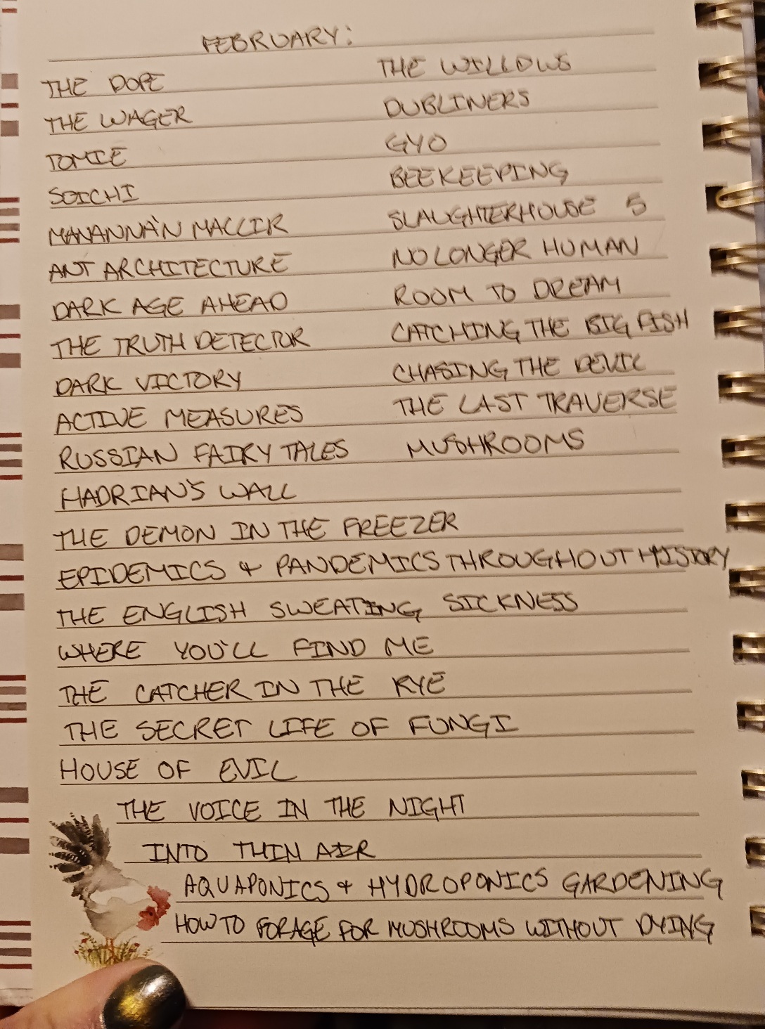 34 books in feb. a nice mix mostly consisting of people freezing to death in the mountains, junji ito, and outdoorsey/garden stuff