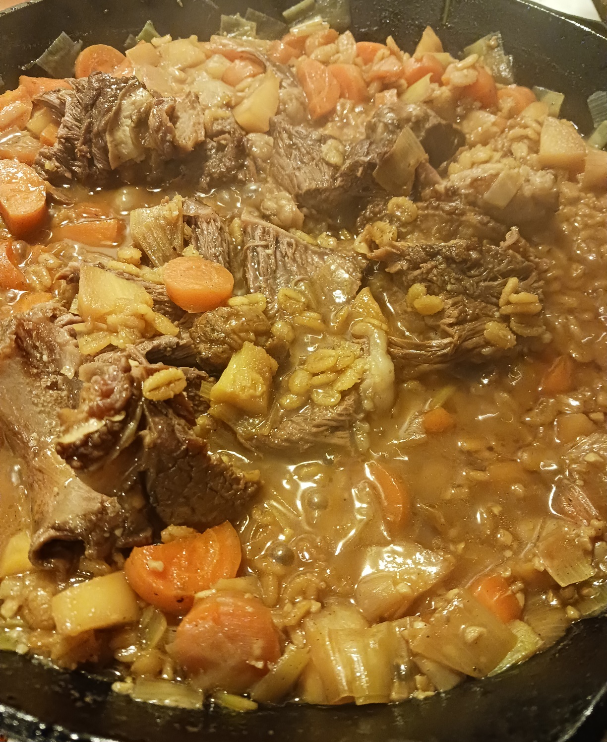 2 pounds short ribs, beef stock, some port wine, 2 carrots, one parsnip, some barley n some minced garlic