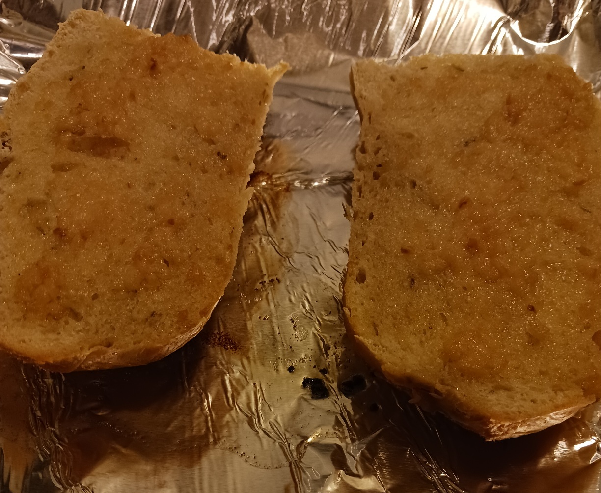 used rosemary olive oil bread, took a half a stick of butter n some minced garlic n melted it. poured it, n baked it on low to get it crispy crunchy