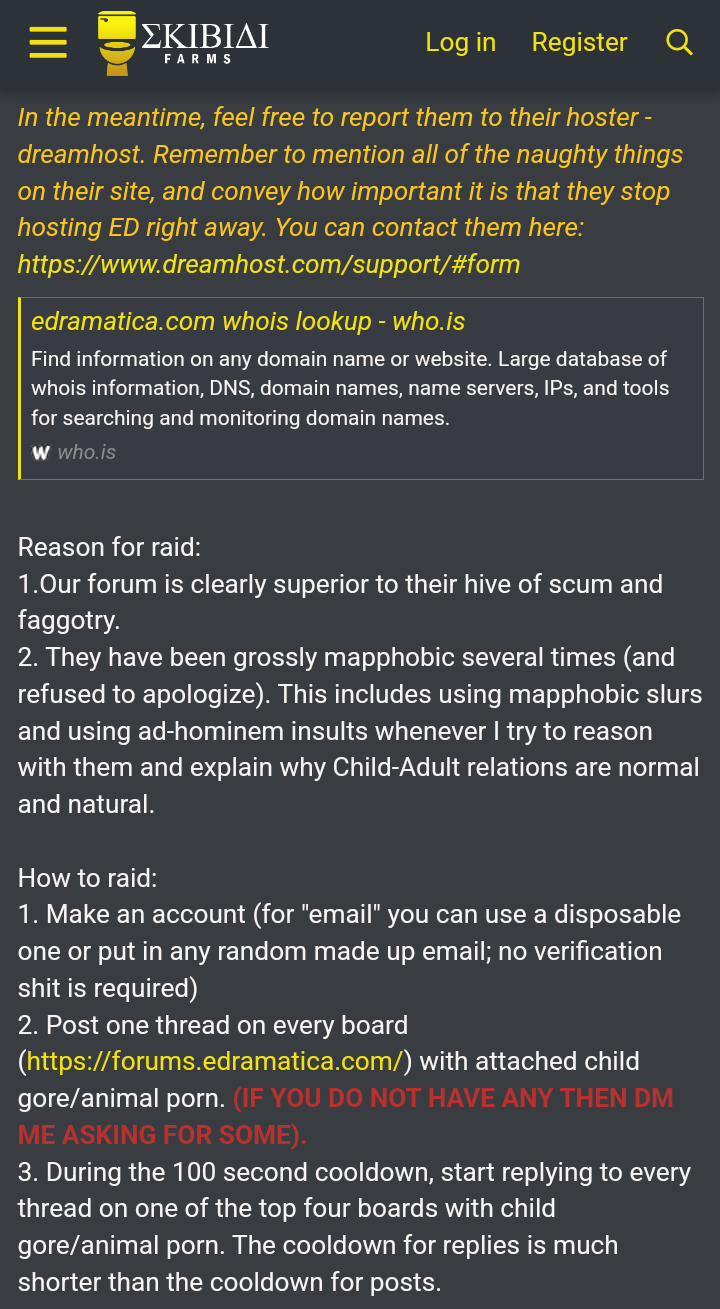 I have a consensus — if you actually want this website to be shutdown, the first thing to do is to actually look for incriminating evidence and send it to the FBI because of the fact that it's a US based website. Calling for raids or mass reports for shit like this is going to have them be taken less seriously in the future. In the meantime, it's better off to not respond to these attention starving clowns.Sklbldl Farms deserves to be shut down because some of its members are literal tranny pedophiles