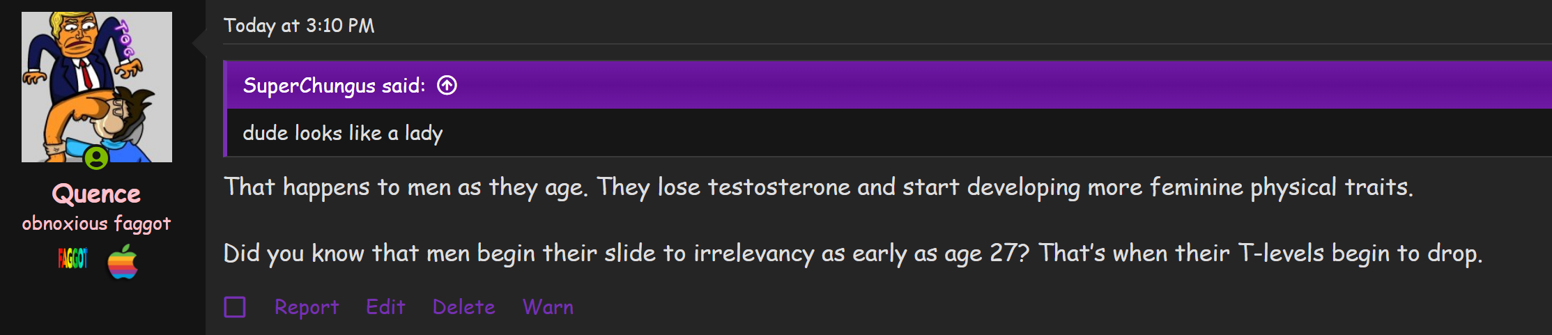 Where did you get that erroneous information?or men over 27 lose all their testosterone and turn into twinks