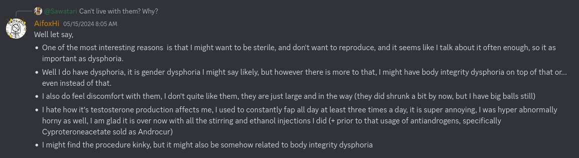 It might be Body Integrity Identity Disorder, as a kid I want to cut my fucking leg(s) off after all, I don't even know for sure if I am trans, I mean I love estrogen, but I don't see myself as male or female.+if your problem is gender dysphoria, cutting off your own dick and balls wont fix that. go to a doctor nigga.