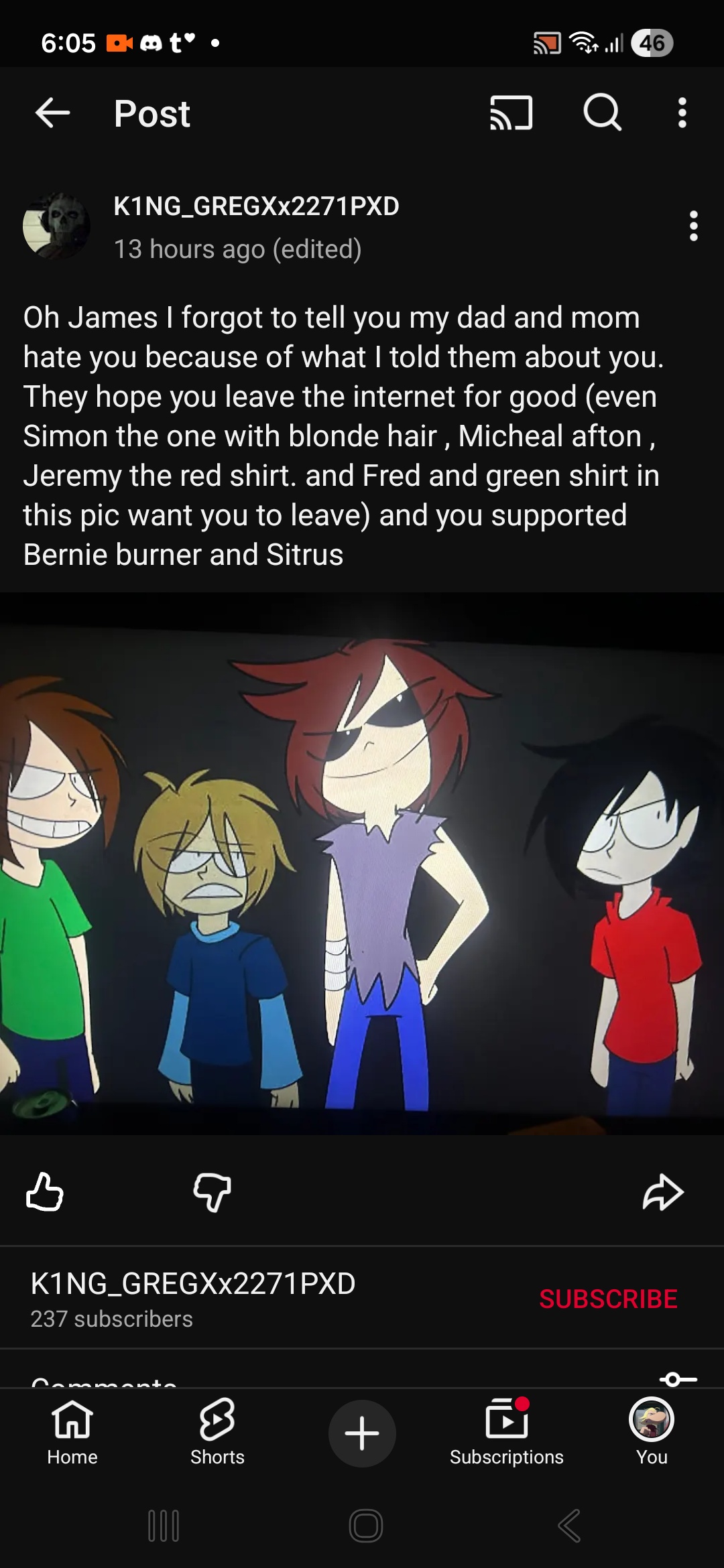 Greg, you need to grow up. Nobody gives a fuck what your parents say, no one should cate considering you supported Disease (known as 'Pretty Deadly Thing', the creator of Pretty Blood). You love your pedo daddy so much that you still considering to support him. So sad and pathetic.