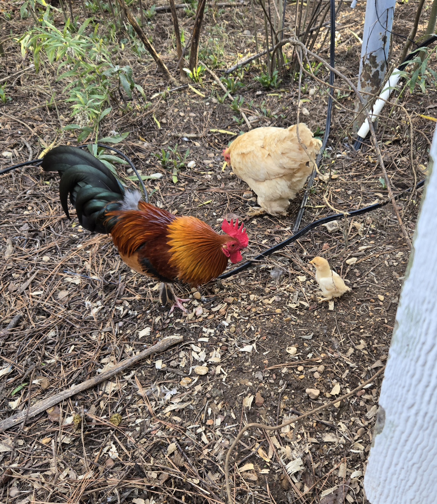 artemis n her chick tried to come outside while i was throwing treats n then bandit saw the little yellow fluffy nugget n picked it up by the neck because she's racist against cochins so i had to move them indoors