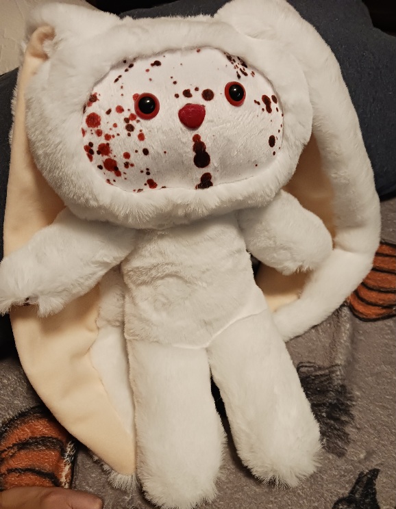 i'm wondering tho if i should've just left the whole face fuzzy white fabric n used a red fabric marker more around the mouth area ('less is more' mentality) or if i should've used one of the less splattery blood splatter fabrics i have (ofc i have more than one type of blood spatter fabric)