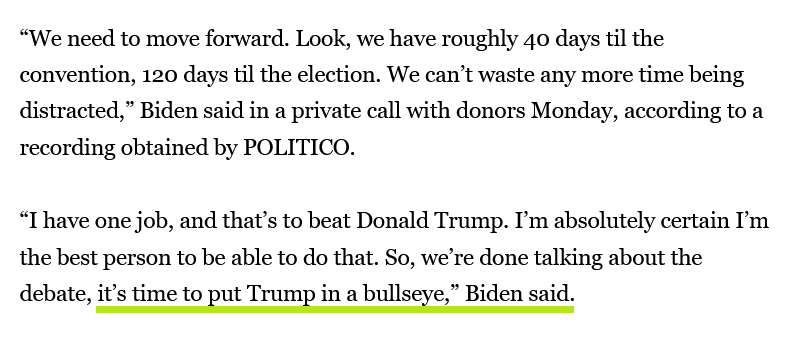 Should just have had seal team six do it properly, in the interest of the nation. It is legal now after all.On July 8th, 2024, Joe Biden said: "We’re done talking about the debate, it’s time to put Trump in a bullseye."
